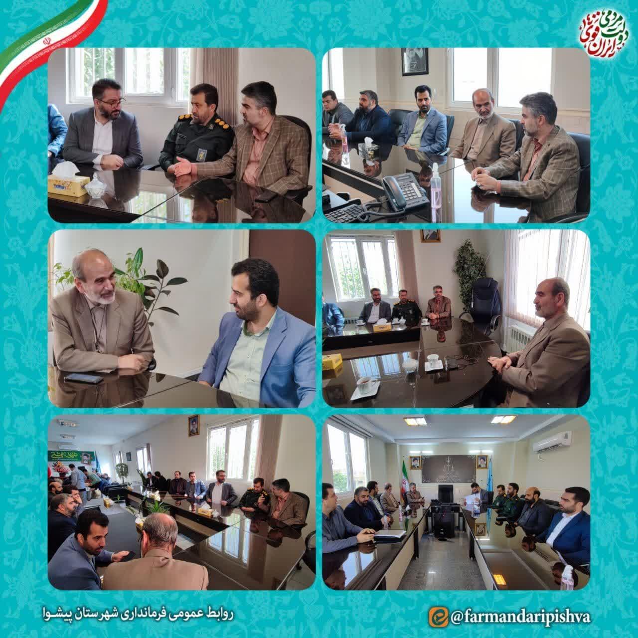 فرماندار شهرستان پیشوا ضمن ابراز خرسندی از این دیدار صمیمانه بیان داشت : اساس فعالیت همه قوا، همدلی ، هم افزایی و همکاری است و اولویت برای همه مسئولان و خدمتگزاران نظام مقدس جمهوری اسلامی ایران اعتماد سازی و ایجادامید و افزایش رضایت مندی عموم مردم است که انشاالله این حسن دوستی و برادری باعث شود تا خدمت بهتری را به مردم شریف شهرستان ارائه دهیم.